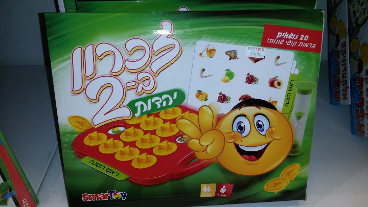 Teaching children to get along with others, this is Memory for Two. We don’t play Memory by ourselves in Israel. It’s a group game here. And it’s a religious experience. How do I know this? Because even the smilies have Yarmulkes.