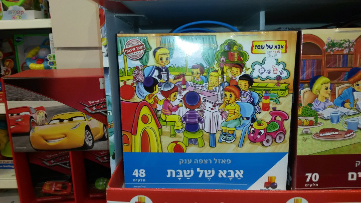 This puzzle depicts the famous “Abba Shel Shabbat” or “Shabbos Abba” that takes place in nurseries across the country every Friday when one boy is chosen to be the “Shabbos Abba” and one girl the “Shabbos Ima.” This is the best day of the year for the chosen child and the worst day of the year for the other 29 in his class. The Shabbos Abba gets to do many of the things an actual Abba does such as make Kiddush and Hamotzi. It does not come with other Abba responsibilities such as paying the utilities bill or the mortgage. You can practice that when you play Monopol.