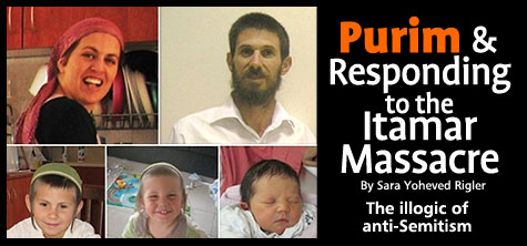 In the wake of the massacre in Itamar and the perverse failure of world governments and media to condemn such brutality against Jews, a ripple of fear can be felt here in Israel. I admit that reading Zusha’s cellphone screen, I felt an encroaching darkness. More and more 2011 resembles 1939. Purim is our paradigm for how to respond to murderous designs against us—to resolutely come closer to God and to each other.