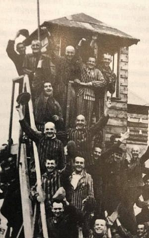 A photo taken at the liberation of the Buchenwald concentration camp. Hertz Jospa is in the top row in the center. (Courtesy of the Jospa family)
