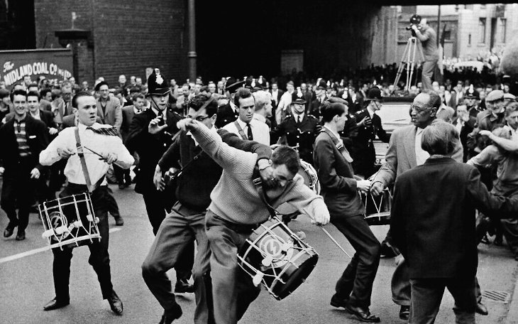 An irate spectator attacks a drummer of British fascist leader sir Oswald Mosley, leader of the extremist right-wing British union movement, during a march through Manchester, England on July 29, 1962.