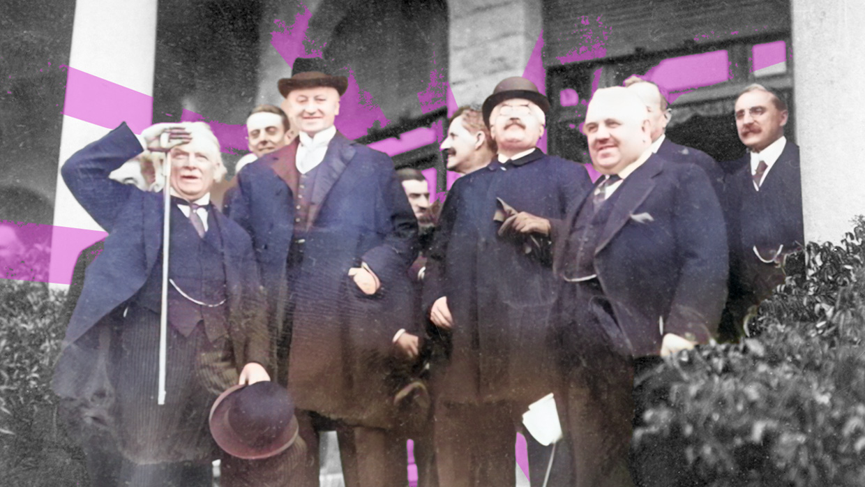 After the resolution on 25 April 1920, standing outside Villa Devachan, from left to right: Japan’s Matsui, British Prime Minister Lloyd George, Earl Curzon, French diplomat Philippe Berthelot, Prime Minister Millerand, Vittorio Scialoja, Italian Prime Minister Nitti