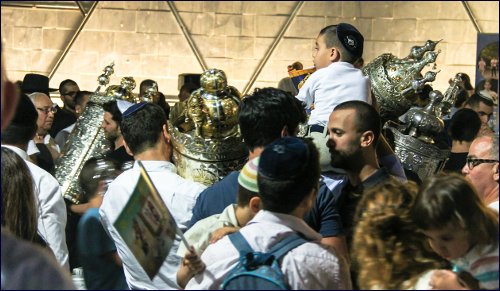 On this day, we carry the Torah scrolls and dance for hours around the bima (the platform where the Torah is read) – celebrating the completion of the yearly cycle of Torah readings, and the beginning of a new cycle.