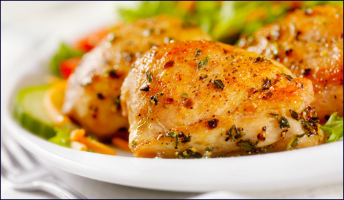 - Quick-cooking chicken fillets are another time-saver. Here’s a fantastic recipe for Chicken with Spring Onion and Mustard Sauce: Cut 8 chicken thigh fillets in half; place chicken in a bowl and toss with ¼ Dijon mustard until well coated. Heat 2 T oil in a large pan; add chicken in a single layer and cook over high heat for 5 minutes or until golden brown, turning once; remove from pan. Add 6 chopped spring onions (green onions) to pan and stir over medium heat for 1 minute. Add 1 T flour to the pan, and stir for another minute. Add 1 ½ chicken stock (this can be pre-purchased or made with water and instant powdered soup stock) and 1 T chopped thyme to pan. Stir until smooth and bring to a boil. Return chicken to the pan, reduce heat to low, and cook, uncovered, turning occasionally, for 10 minutes or until chicken is tender. (This is very nice served with rice.) Serves 6-8.