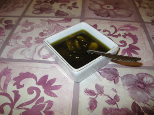 Dice onion into small pieces. Mash 3-5 cloves of fresh garlic. Slice leaves of fresh basil, parsley and/or dill. Add to olive oil.