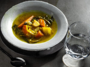 For smaller soup, half the ingredients: I.e., 2 carrots, ½ zucchini, ½ sweet potato, ½ butternut squash, 2-4 stalks of celery, 1 onion, 2 garlic cloves, 4 mushrooms, bag of spinach…
