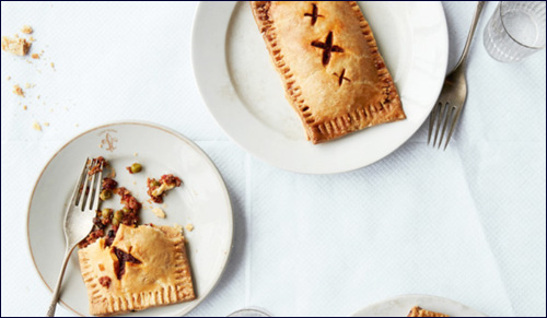 Roll out dough on a lightly floured surface to 12” squares. Cut each into 4 squares; transfer to 2 parchment-lined baking sheets. Spoon filling onto one side of squares, leaving ½” border. Brush edges with egg and fold dough over filling. Press to seal; crimp with a fork. Cut a few vents in tops; brush with egg. Bake until pies are golden brown, 30–35 minutes. Let cool slightly.