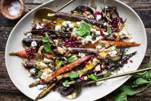 Roasted vegetables topped with tahini and pomegranate seeds have become my go-to, totally trendy, absolutely stunning, and delicious side dish. For Rosh Hashanah, I usually use colorful, artisanal carrots, but butternut squash or cauliflower work well too.