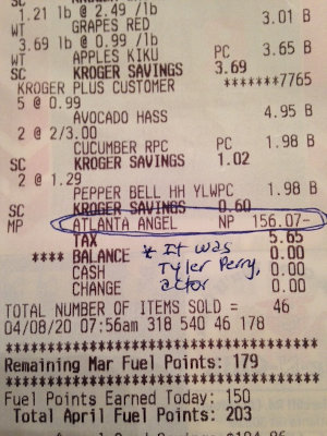 After I rang up my groceries at the self-checkout, the cashier took care of the payment at her register. Indeed, the receipt simply said, “Atlanta angel, $156.07.” I left in a cloud of delight, thanking the heavens and wondering who my angel was.