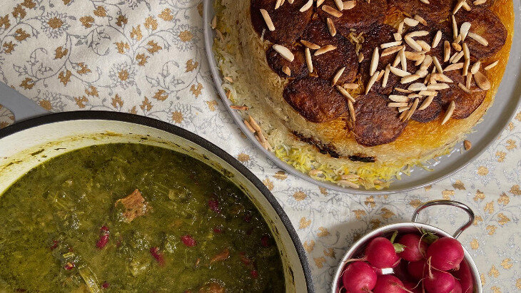 Persian rice dishes are often served along with one of the numerous types of exquisite slow-cooked braises called “khoresh” (خورش). Popular khoreshes include yellow split pea khoresh and green herb khoresh that gets poured over the crunchy rice.