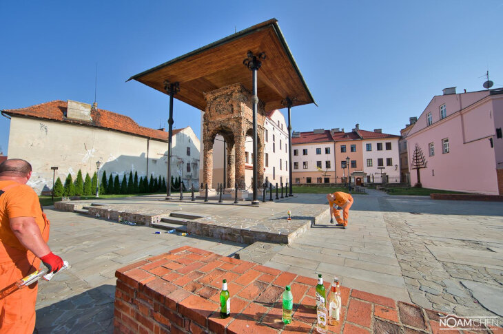 The Old Synagogue of Tarnów, built in 1630, was destroyed by the Nazis in November 1939. Of the original structure, only the Bimah - a four-pillared podium used for reading the Torah - survived. Today, it is the sole remnant of more than 30 synagogues and houses of prayer that once stood in this town.