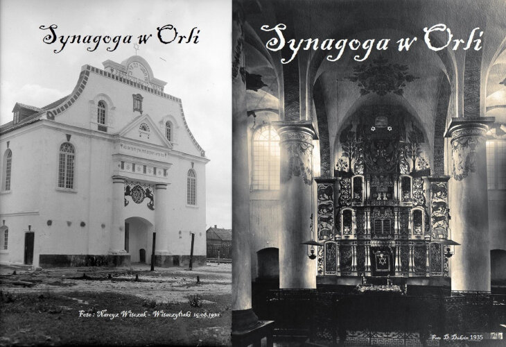 Historic photos showing the synagogue’s exterior (left, source: Narcyz Witczak Witaczyński 1932) and Aron HaKodesh (right, source: D.Duksin 1935).