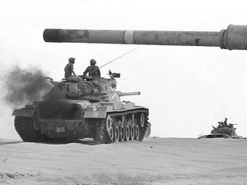 Yossi and Amos came up with an idea. Amos would put a helmet on top of a rifle, and gradually raise the helmet over the surface of the ground. If it drew fire from the tanks, he’d quickly lower it, knowing that this spot is too hot from which to fire. He’d then move to another spot and try it again. If Amos received no fire, he’d jump up with his binoculars, determine the range of the target tank, and quickly tell Yossi. Yossi would then jump up, completely exposing himself to the enemy, and take his best shot.