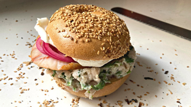 - Spread white fish salad on one side. Top with sable, red onions and capers.
