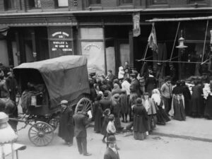 By 1904, 35 Jewish families lived in Limerick, most from present-day Lithuania. Several came from the Lithuanian shtetl of Akmayan, which was 80% Jewish, where Jews faced constant harassment and discrimination from Russian authorities. (In 1915, every Jew in Akmayan was ordered to leave.) These newcomers settled around Colooney Street (today Wolfe Tone Street), established a Jewish cemetery, and began building a community. Two homes served as synagogues. Local Jews formed a mutual aid society to help those in need. Desperately poor, most worked as peddlers, selling clothes, shoes, books, and other goods.