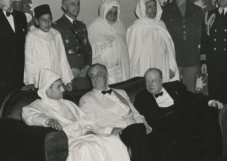 Sultan Mohammed seated with Franklin D. Roosevelt and Winston Churchill during the 1943 Casablanca Conference; his son Prince Hassan is pictured standing behind him
