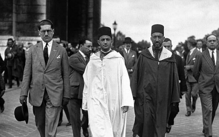 Morocco's Mohammed V, wearing white robes, walking with the country's Grand Vizier Si Mohammed El Mokri after he placed a wreath on the Tomb of the Unknown Warrior at the Arc De Triomphe during a visit to Paris, France around July 4, 1930. (AP Photo)