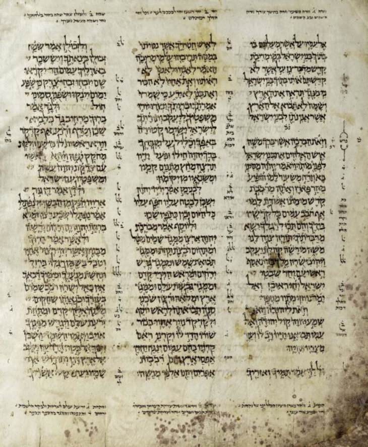 A section of the Aleppo Codex, the earliest known full text of the Torah, written in 10th century Tiberias. Source: Yad Ben Zvi, Public domain, via Wikimedia Commons