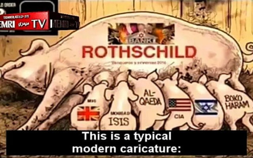 A screenshot from the Russian Channel 1 segment depicting the Rothschilds as a sow, and Israel, the CIA, MI6, ISIS, Al-Qaeda, and Boko Haram as nursing piglets. (Screenshot/MEMRI-TV)