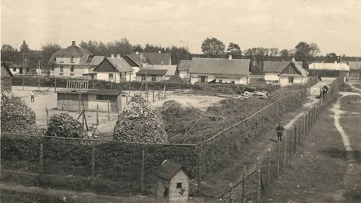 The fence at the entrance of Sobibor was covered with tree branches to camouflage the mass-murder operation. (U.S. Holocaust Memorial Museum)