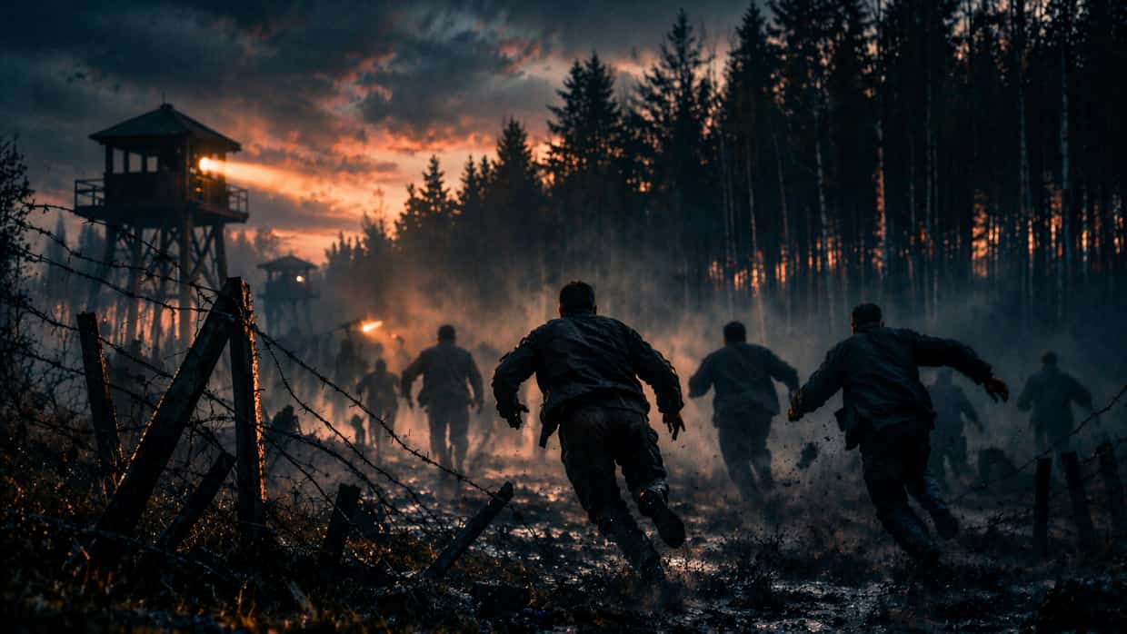 Machine gun fire erupted from the watchtowers as prisoners threw themselves toward the perimeter. The barbed wire buckled and collapsed under the weight of bodies pressing against it. Hundreds sprinted through smoke and shrapnel into the open fields beyond Sobibor. Mines detonated beneath their feet. Many fell, shot from the towers or torn apart in the minefield, but the surge did not stop.