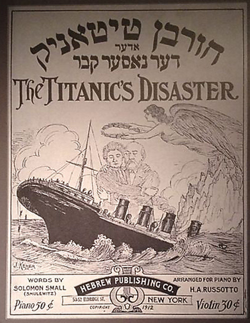 8. The Jewish community viewed the sinking of the Titanic as a collective, personal tragedy. The Yiddish lyricist Solomon Small penned an original song in honor of the dead of the Titanic, titled “Der Nasser kever” or “The Watery Grave”, which reflected the feelings of the American Jews at the time. The lyric ended with a stanza honoring Ida Strauss, “But listen to that woman soul – I won’t stir from the spot, I’ll die here with my husband.” An illustration published along with the sheet notes of the song was a photo of a man and a woman hovering above a stormy Titanic with halos on their heads -- in dedication to Ida and Isidor Strauss.