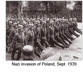 September 1939 – On September 1, Hitler invades Poland, marking the beginning of World War II. Two days later, Britain and France, obligated by treaty to help Poland, declare war on Germany. In less than four weeks, Poland collapses. Heydrich orders ghettos to be established in occupied Poland. German Jews are forbidden to own radios and a nighttime curfew is imposed.