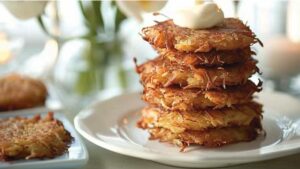These crispy, golden potato pancakes are a Hanukkah staple but can be enjoyed any time of year. Serve with sour cream or applesauce for a comforting and delicious treat.
