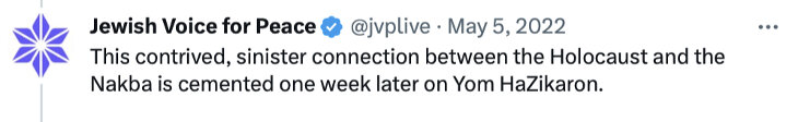 Consider a 13-part Twitter thread JVP posted in May 2022, wherein JVP says that Yom HaShoah, Israel’s Holocaust Memorial Day, was founded as a vital cog for an Israeli subterfuge. It begins: “The Israeli state calendar sequentially commemorates the Holocaust, Israeli soldiers, and the creation of the state, promoting the false Zionist narrative that the Holocaust justifies the ethnic cleansing of Palestinians.” This “false Zionist narrative,” it continues, is part of “a sequence of fabricated, secular holidays, tim(ed) to fall just after Passover on the Jewish calendar…to establish a mythical pattern of Jewish history as recurring cycles of oppression and freedom.”