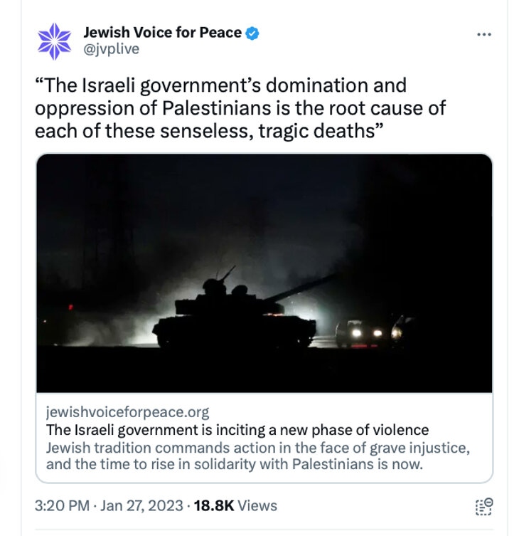 That evening, a Palestinian terrorist killed seven Jews and wounded ten more at a Jerusalem synagogue. Within hours, JVP posted a second January 27th tweet: “The Israeli government’s domination and oppression of Palestinians is the root cause of each of these senseless, tragic deaths” JVP said, “Jewish tradition commands action in the face of grave injustice and the time to rise in solidarity with the Palestinians is now.” Not a single mention of the seven Israeli Jews murdered by a Palestinian terrorist, nor the ten who were wounded.