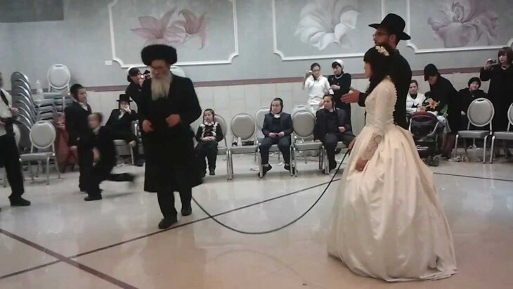 At Hasidic weddings, men and women dance separately. But for the Mitzvah Tantz, the bride holds onto a gartel—a type of belt worn during prayer—while her partner holds the other end and dances before her. Some dances last for an hour, others go until morning.