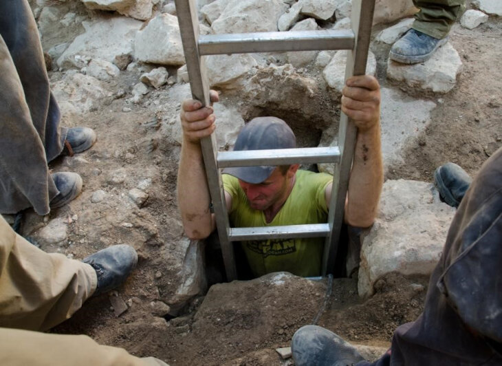The Drainage Channel and the Excavator going down the ladder, City of David Archives