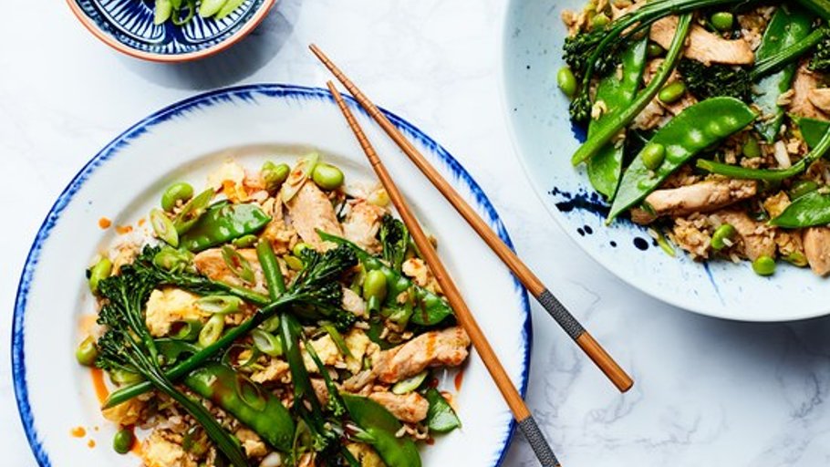 Fold in snow peas, edamame, soy sauce, and orange juice. Cook, tossing, until warmed through, about 1 minute. Add chicken mixture and toss to combine.
