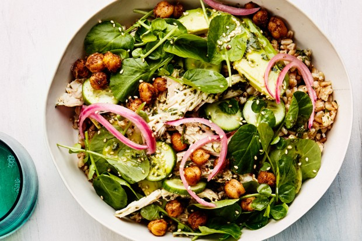 I’ve always been a “bowl” kinda eater, long before poke bowls, grain bowls, etc. became the rage. I love the warm grains and protein, mixed with the cool crisp greens and a nice dressing tossed on top. This one has a mediterranean flair, but feel free to experiment and make up your own versions too.