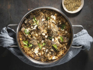 This is a full balanced meal in one skillet. I use either leftover grilled chicken or schnitzel or you can use fresh, raw chicken cut into thin strips. It can be made in the morning or right before serving. I also use white rice, brown rice or leftover quinoa. It’s important that the grain has been refrigerated for a few hours before using, meaning leftover is best in this dish.