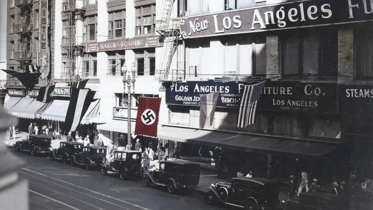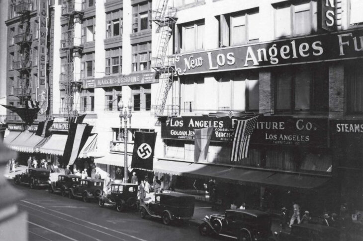 Nazi symbols could be spotted all over downtown Los Angeles in the 1930s. Here, a swastika hangs above the street outside a furniture store on Broadway. (Photo/Courtesy of Steve Ross)