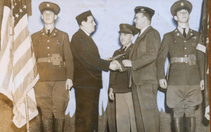 Leon Lewis receiving the Americanism Award from American Legion, in June 1939. (USC Libraries Special Collections)