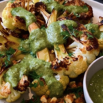 Place cauliflower in a shallow tray or bowl with a rim. Drizzle with tahini all over and then with salsa verde. Finish with micro greens if you like.